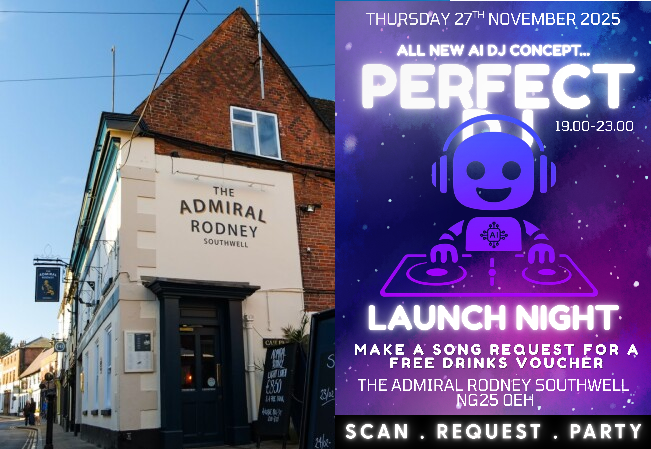For the very first time ever, Perfect DJ – the world’s first fully AI-controlled party entertainment system – is stepping out of the lab and into the real world. And we’re bringing the full experience to The Admiral Rodney Pub in Southwell for an unforgettable Launch Night Demo on Thursday, 27th November 2025, 7:00 PM – 11:00 PM.